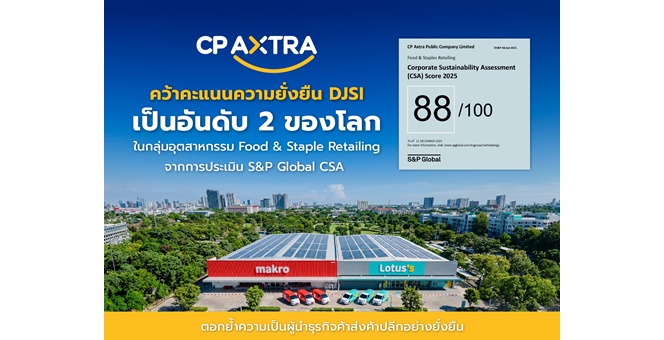 ซีพี แอ็กซ์ตร้า คว้าคะแนนความยั่งยืน DJSI 88/100 เป็นอันดับ 2 ของโลก ในกลุ่ม Food & Staples Retailing จากการประเมิน S&P Global CSA ตอกย้ำผู้นำด้านความยั่งยืนค้าส่งค้าปลีกไทย