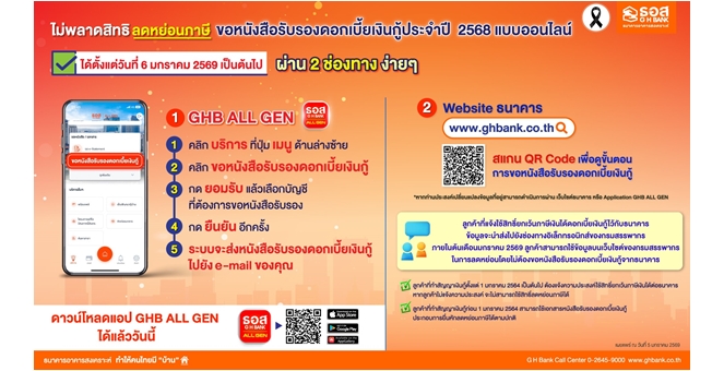 • ไม่พลาดสิทธิลดหย่อนภาษี! ขอหนังสือรับรองดอกเบี้ยเงินกู้ได้ง่ายๆ กับ ธอส.ผ่าน Application : GHB ALL GEN และ www.ghbank.co.th ตั้งแต่วันที่ 6 มกราคม 2569 เป็นต้นไป