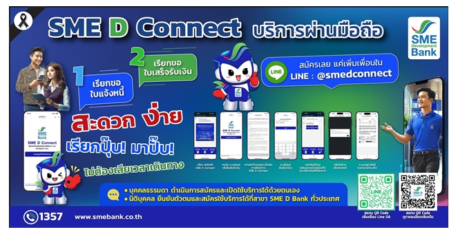• SME D Bank เปิดบริการใหม่ “SME D Connect” เรียกขอใบเสร็จรับเงิน-ใบแจ้งหนี้ ผ่านสมาร์ทโฟนอำนวยความสะดวกลูกค้าบุคคลธรรมดาและนิติบุคคล เริ่ม 7 ม.ค. เป็นต้นไป