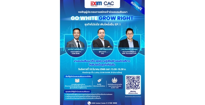 • EXIM BANK เชิญผู้ประกอบการที่สนใจเข้าร่วมอบรมสัมมนา “GO WHITE GROW RIGHT ธุรกิจโปร่งใส เติบโตยั่งยืน EP.1”