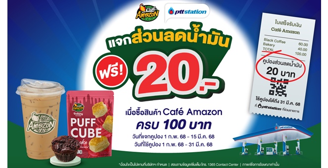 พีทีที สเตชั่น ร่วมกับ คาเฟ่ อเมซอน แจกโปรสุดปัง! ซื้อสินค้า คาเฟ่ อเมซอน ครบทุก 100 บาท รับส่วนลดน้ำมันท้ายใบเสร็จ 20 บาท