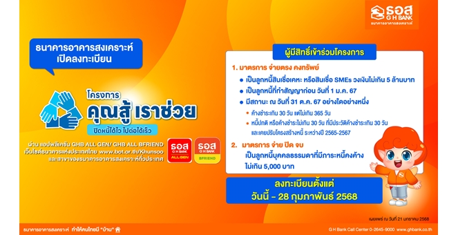 star_borderModal Upgrade PackageModal Upgrade Packageธอส. พร้อมช่วยเหลือและแบ่งเบาภาระลูกค้าในการชำระเงินงวด เปิดลงทะเบียน “โครงการคุณสู้ เราช่วย” ตั้งแต่วันนี้ ถึงวันที่ 28 กุมภาพันธ์ 256821 ม.ค. 2568 11:30 น.