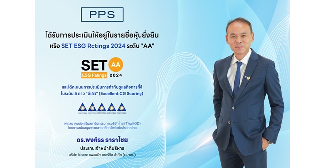 star_borderModal Upgrade PackageModal Upgrade PackagePPS ได้รับผลการประเมิน SET ESG Ratings ปี 2567 ที่ระดับ “AA” เป็นปีที่ 2 คว้า CGR ระดับ 5 ดาว “ดีเลิศ” ต่อเนื่องเป็นปีที่ 1020 ธ.ค. 2567 10:39 น.