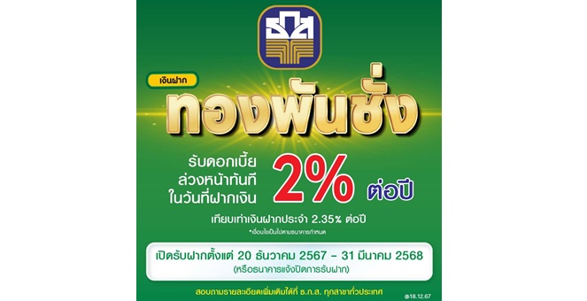 star_borderModal Upgrade PackageModal Upgrade Packageธ.ก.ส. เปิดตัว“เงินฝากทองพันชั่ง” รับดอกเบี้ยทันทีในวันที่เริ่มฝากเงิน20 ธ.ค. 2567 10:46 น.