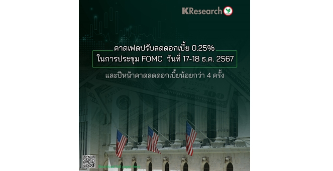 • ศูนย์วิจัยกสิกรฯ คาดเฟดปรับลดดอกเบี้ย 0.25% ในการประชุม FOMC วันที่ 17-18 ธ.ค. 2567 และปีหน้าคาดลดดอกเบี้ยน้อยกว่า 4 ครั้ง