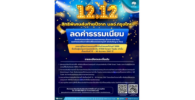 • KTAM จัดโปร 12.12 ลดค่าธรรมเนียมการขายและสับเปลี่ยนหน่วยลงทุนเข้า* สำหรับผู้ลงทุนที่เปิดบัญชีผ่านแอป KTAM Smart Trade