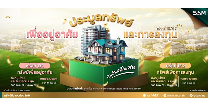 SAM นำทรัพย์เด่นเพื่ออยู่อาศัยและลงทุนบนทำเลดีทั่วประเทศ จำนวน 55 รายการ มูลค่ารวมเกือบ 300 ลบ. จัดประมูลครั้งที่ 13 ในวันที่ 24 ธ.ค.และ 7 ม.ค.68 นี้