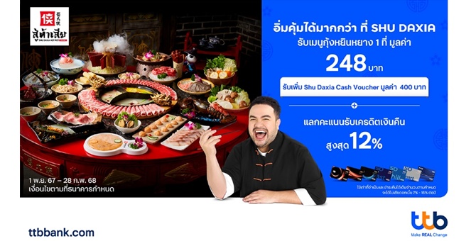 star_borderModal Upgrade PackageModal Upgrade Packageครั้งแรกกับโปรโมชันสุดคุ้ม ที่ร้าน SHU DAXIA บัตรเครดิต ttb ชวนอิ่มคุ้มได้มากกว่า รับสิทธิพิเศษ พร้อมแลกคะแนนรับเครดิตเงินคืนสูงสุด 12%28 พ.ย. 2567 15:31 น.