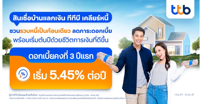 • ทีทีบี ชวนคนไทยรวบหนี้เป็นก้อนเดียว ลดภาระดอกเบี้ยให้เบาลงส่งท้ายปี ด้วย “สินเชื่อบ้านแลกเงิน ทีทีบี เคลียร์หนี้” เตรียมพร้อมก้าวสู่ปีใหม่ด้วยชีวิตการเงินที่ดีขึ้น