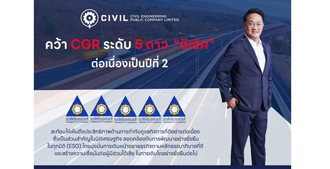 CIVIL คว้า CGR ระดับ 5 ดาว “ดีเลิศ” ติดต่อกันเป็นปีที่ 2 จัดอยู่ในกลุ่ม “Top Quartile” ตอกย้ำความมุ่งมั่นการกำกับดูแลกิจการที่ดี