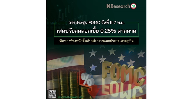 • ศูนย์วิจัยกสิกรฯ เผยการประชุม FOMC วันที่ 6-7 พ.ย. เฟดปรับลดดอกเบี้ย 0.25% ตามคาด ทิศทางข้างหน้าขึ้นกับนโยบายและตัวเลขเศรษฐกิจ