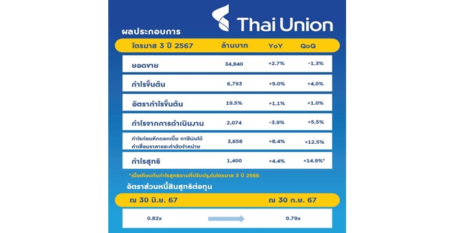 • ไทยยูเนี่ยนยืนหนึ่งโกยกำไรสุทธิไตรมาส 3 ทะลุ 1.4 พันล้านบาท พร้อมสร้างสถิติทำอัตรากำไรขั้นต้นสูงสุดที่ 19.5%