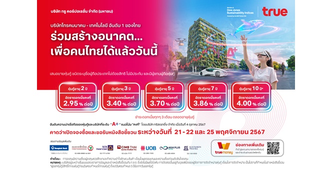 ได้เวลาจองแล้ว….. หุ้นกู้ ทรู คอร์ปอเรชั่น ใหม่ 5 ชุด เคาะดอกเบี้ย 2.95-4.00% ต่อปี พร้อมเรทติ้ง “A+” คาดให้จองซื้อวันที่ 21-22 และ 25 พ.ย. นี้
