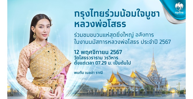 • กรุงไทยชวนเที่ยวงานหลวงพ่อโสธร ดึง “เบลล่า ราณี” ร่วมริ้วขบวน “ปักษาวายุภักษ์นครา สู่สายศรัทธาแห่งความยั่งยืน” 12 พ.ย.นี้