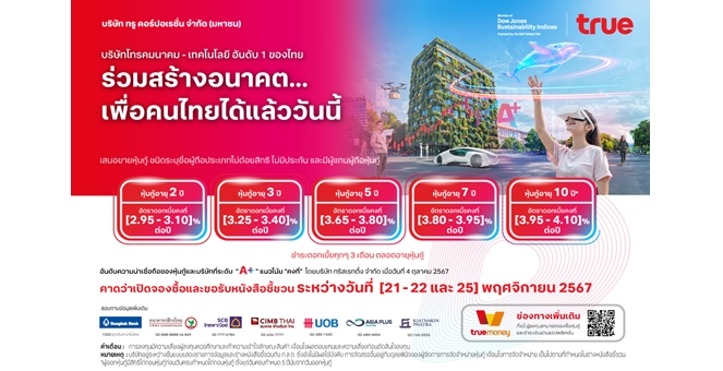 star_borderModal Upgrade PackageModal Upgrade Package“ทรู คอร์ปอเรชั่น” เตรียมเปิดจองซื้อหุ้นกู้ชุดใหม่ ดอกเบี้ย [2.95 – 4.10]% ต่อปี อันดับเครดิต “A+” โอกาสลงทุนปลายปี คาดเปิดให้จองซื้อวันที่ 21-22 และ 25 พฤศจิกายน 25678 ต.ค. 2567 14:47 น.