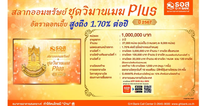 สลากออมทรัพย์ ธอส. ชุดวิมานเมฆ Plus ปี 2567 ให้ผลตอบแทนสูง โอกาสถูกรางวัลสูง คุ้มค่าการลงทุน