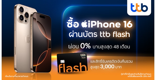 • บัตรกดเงินสด ttb flash มอบสิทธิ์สุดคุ้มซื้อ iPhone 16 ผ่อน 0% นาน 48 เดือน พร้อมรับเครดิตเงินคืนรวมสูงสุด 3,000 บาท