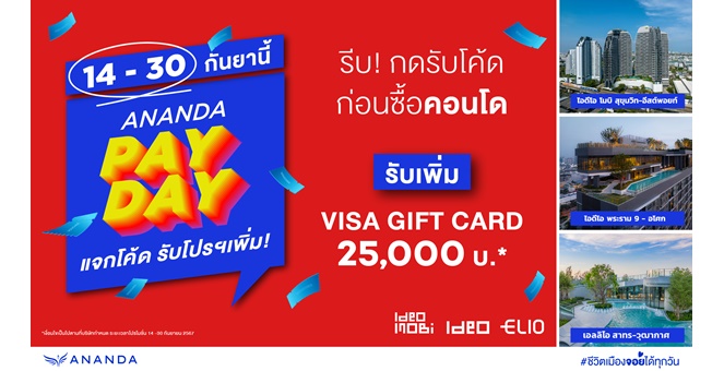 star_borderModal Upgrade PackageModal Upgrade Packageอนันดาฯ เร่งเครื่องต่อเนื่องกระตุ้นกำลังซื้อไตรมาส 3 ชี้โอกาสทองคนอยากมีบ้านและคอนโดพร้อมอยู่ ส่งโปรโมชั่น ANANDA PAY DAY แจกโค้ดรับโปรเพิ่ม VISA GIFT CARD สูงสุดมูลค่า 50,000 บ.*19 ก.ย. 2567 13:46 น.
