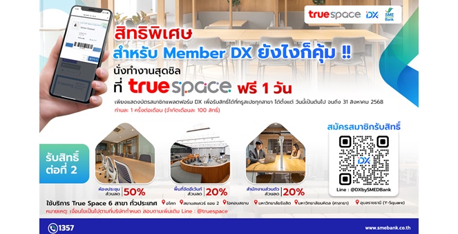 • SME D Bank X True Space จัดเต็มมอบสิทธิประโยชน์เพื่อสมาชิกแพลตฟอร์ม DX ใช้พื้นที่ Co-Working ฟรี หนุนเพิ่มผลิตภาพ ยกระดับธุรกิจไร้ขีดจำกัด