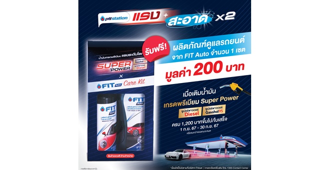 • พีทีที สเตชั่น มอบความแรง+สะอาดX2 เติมน้ำมันเกรดพรีเมียม Super Power ครบ 1,200 บาท รับฟรี FIT Auto Care Kit มูลค่า 200 บาท