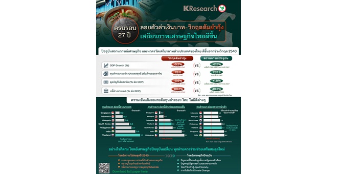 • ศูนย์วิจัยกสิกรฯ เผยครบรอบ 27 ปี ลอยตัวค่าเงินบาท ระดับทุนสำรองฯ ไทยแข็งแกร่ง แต่ยังมีโจทย์ท้าทายทางเศรษฐกิจที่รอแก้ไข