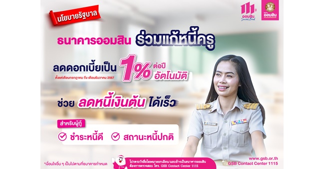 • รัฐบาล เร่ง ออมสิน ช่วยลดภาระหนี้ครู ขับเคลื่อนแก้หนี้อย่างยั่งยืน ประกาศลดดอกเบี้ยกลุ่มครูผ่อนดีเป็น 1% ต่อปี เป็นเวลา 6 เดือน เริ่ม ก.ค. นี้