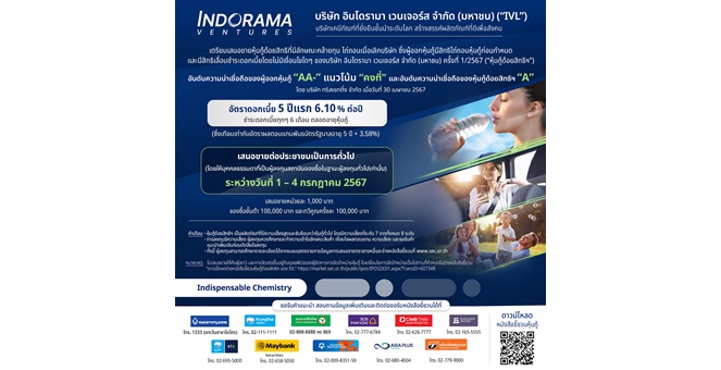 • อินโดรามา เวนเจอร์ส พร้อมเปิดจองซื้อหุ้นกู้ด้อยสิทธิที่มีลักษณะคล้ายทุนฯ 1 - 4 ก.ค. 2567 ชูดอกเบี้ย 5 ปีแรกที่ 6.10% ต่อปี