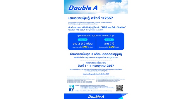 star_borderModal Upgrade PackageModal Upgrade Packageดั๊บเบิ้ล เอ เตรียมออกหุ้นกู้ 1/2567 ดอกเบี้ยสูงสุด 5.80% เปิดจองซื้อ 1-4 ก.ค.นี้12 มิ.ย. 2567 11:48 น.