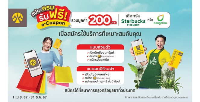 • เปิดบัญชีกรุงศรีพร้อมสมัครใช้บริการแบบ Combo Set ครบจบที่เดียวทุกการใช้จ่าย รับฟรี e-Coupon รวมมูลค่า 200 บาท